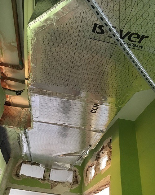 Por otro lado, hay que comunicar cada zona a refrigerar (habitaciones y salón) con un conducto hasta donde se encuentre la máquina interior. Estos tubos se taparán con un falso techo de escayola.